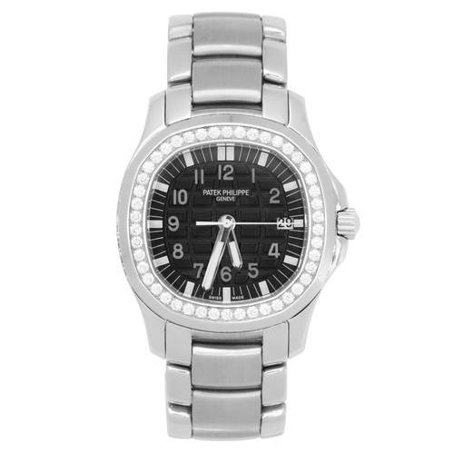 A ladies Aquanaut wristwatch crafted in steel by Patek Philippe. Featuring a black embossed dial with a date aperture and a stainless steel bezel set with 46 round brilliant cut diamonds.