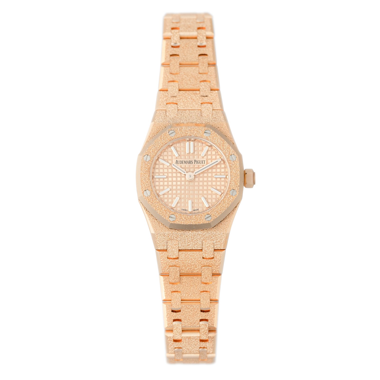 Inspired by the Mini Oak released in the late ’90s and in tribute to the women who have shaped the company’s history, Audemars Piguet unveils the Royal Oak ‘Mini’. The delicate 23mm case is crafted in frosted rose gold and styled with a matching frosted rose gold bracelet. The rose gold-toned dial features the Petite Tapisserie pattern, gold hour markers, and Royal Oak luminescent hands.