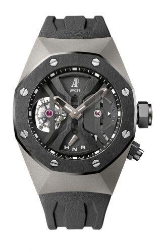 The Royal Oak Concept GMT Tourbillon reference 26560IO.OO.D002CA.01 is a limited edition of 60 pieces introduced in 2011. This watch features a titanium case with a black ceramic bezel; the crown and pushbutton for the GMT function are made of ceramics as