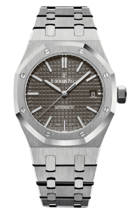 37mm stainless steel case, sapphire crystal back, screw-locked crown, glareproofed sapphire crystal, silver dial with grande tapisserie pattern, pink gold applied hour-markers, and pink gold Royal Oak hands with luminescent coating