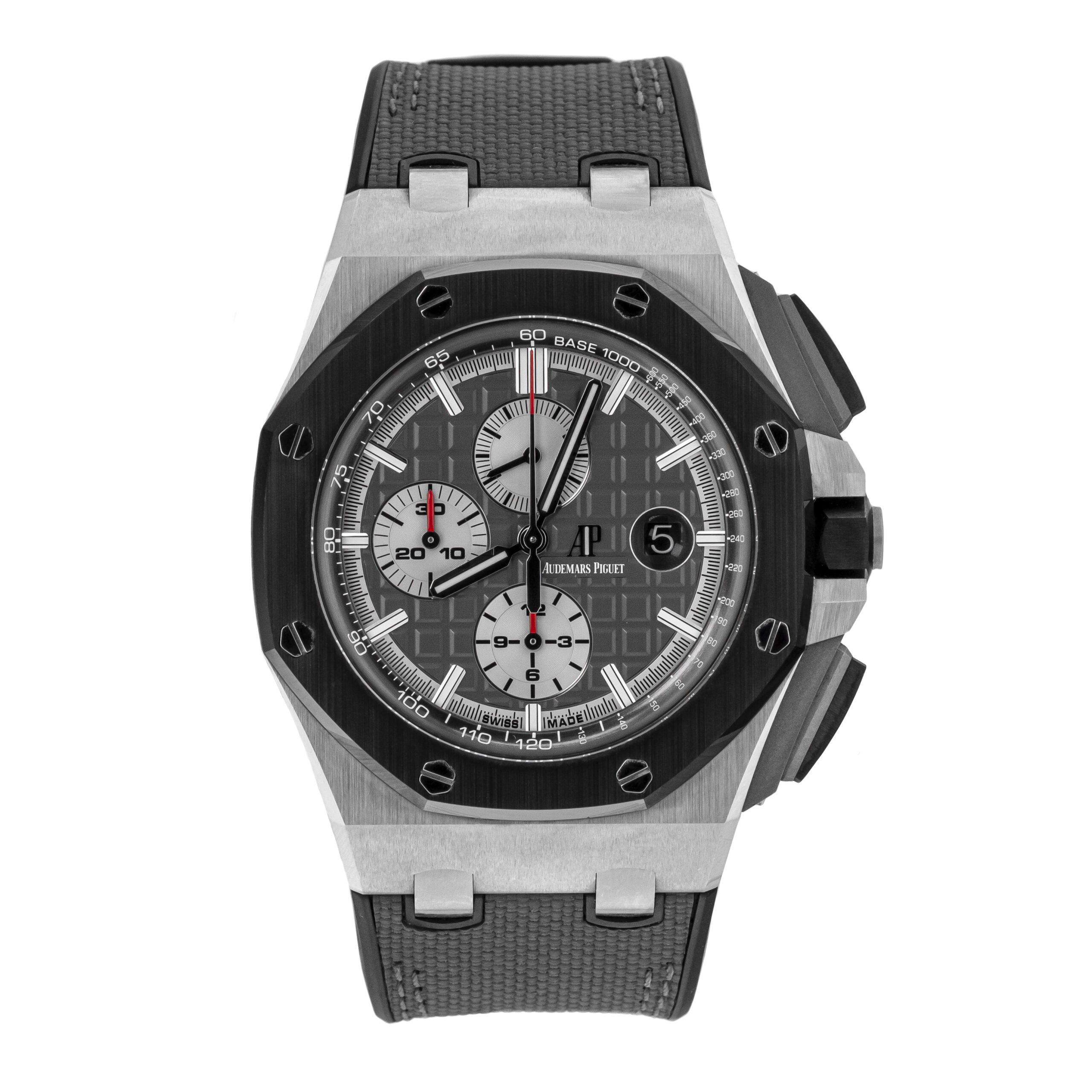 Titanium 44 mm Octagonal Case with Screw Down Crown and a Titanium Bezel. This Audemars Piguet Royal Oak Offshore Chronograph has an attractive Slate Dial with Index Dial Markers.