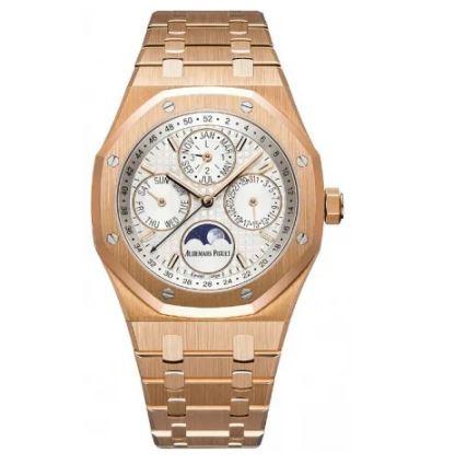 Solid 18kt rose gold case & bracelet, brushed finished with polished bevel corners, Solid 18kt rose gold octagon design bezel secured by 8 polished white gold screws, brushed finished with polished bevel corners.