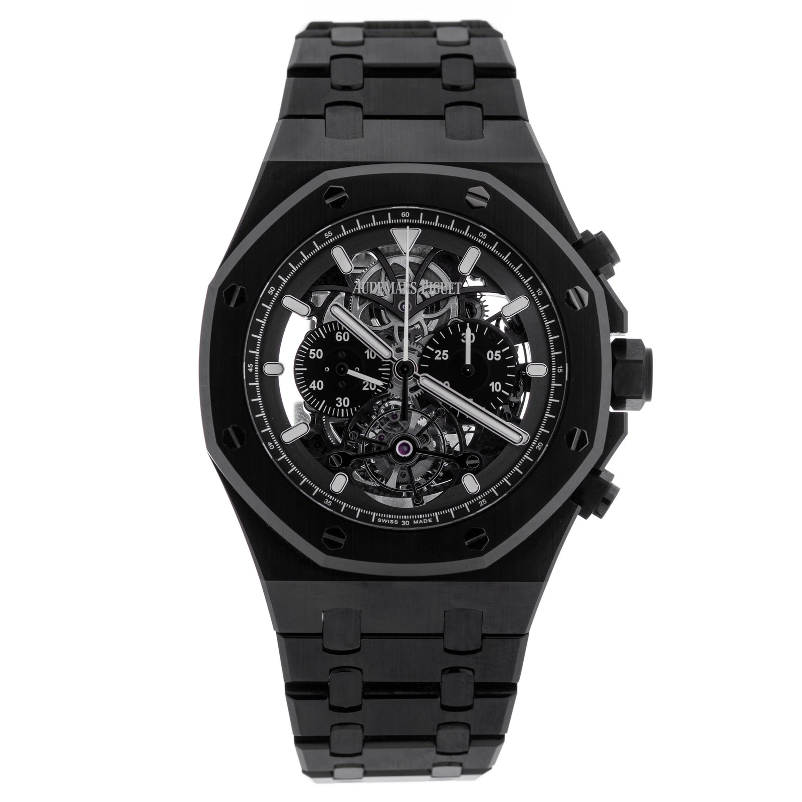 The Audemars Piguet Royal Oak Tourbillon Chronograph features a black ceramic 41mm case and bezel. Its open-worked dial gives a glimpse of the intricate workings inside, while the tourbillon complication adds an extra level of prestige. This watch is finished on a black ceramic bracelet.