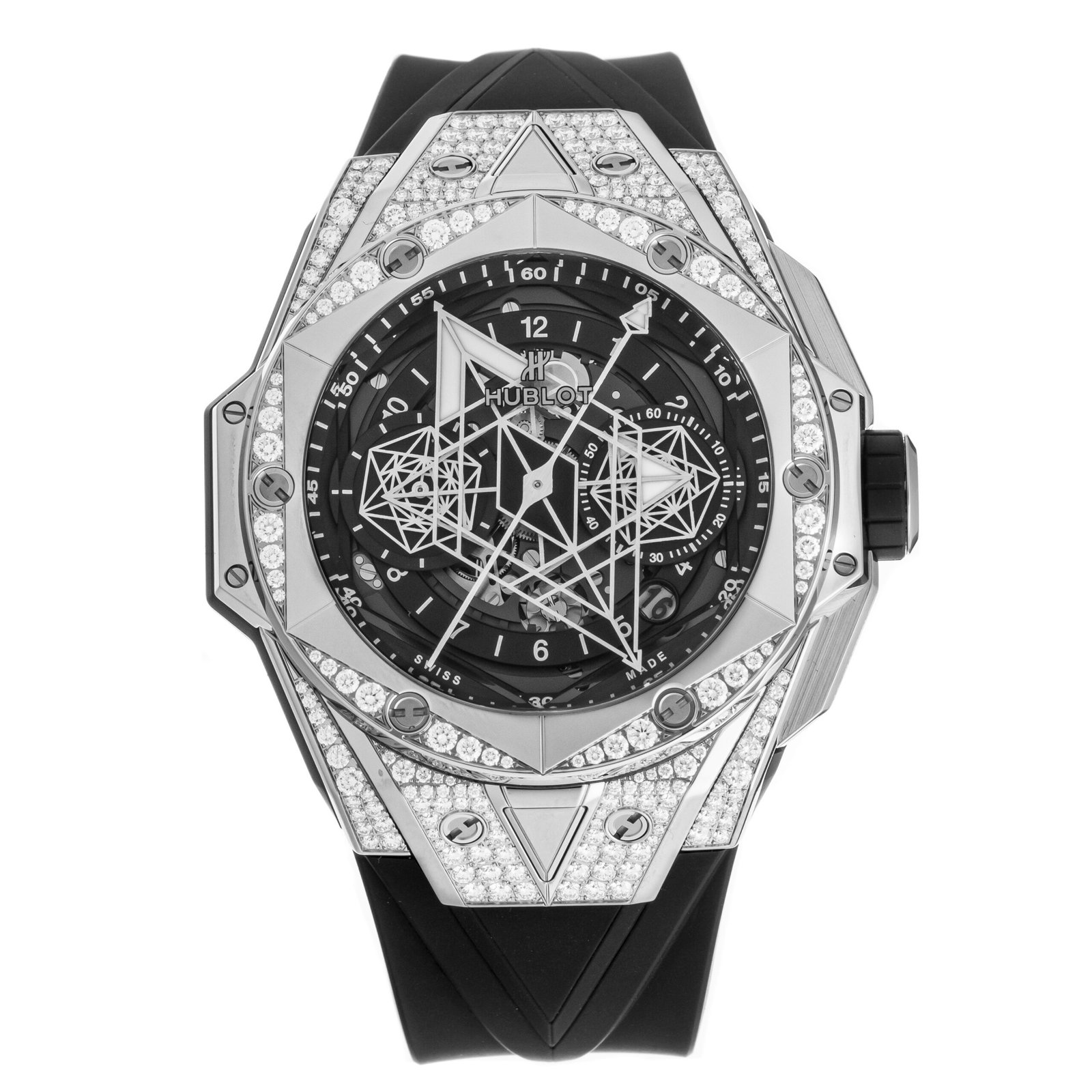 45 mm polished and satin-finished titanium case set with 172 diamonds, hexagonal decor polished titanium bezel set with 48 diamonds