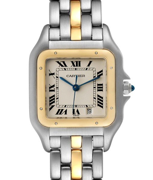 Stainless steel and 18k yellow gold case 26.0 x 36.0 mm. Octagonal crown set with the blue sapphire cabochon.