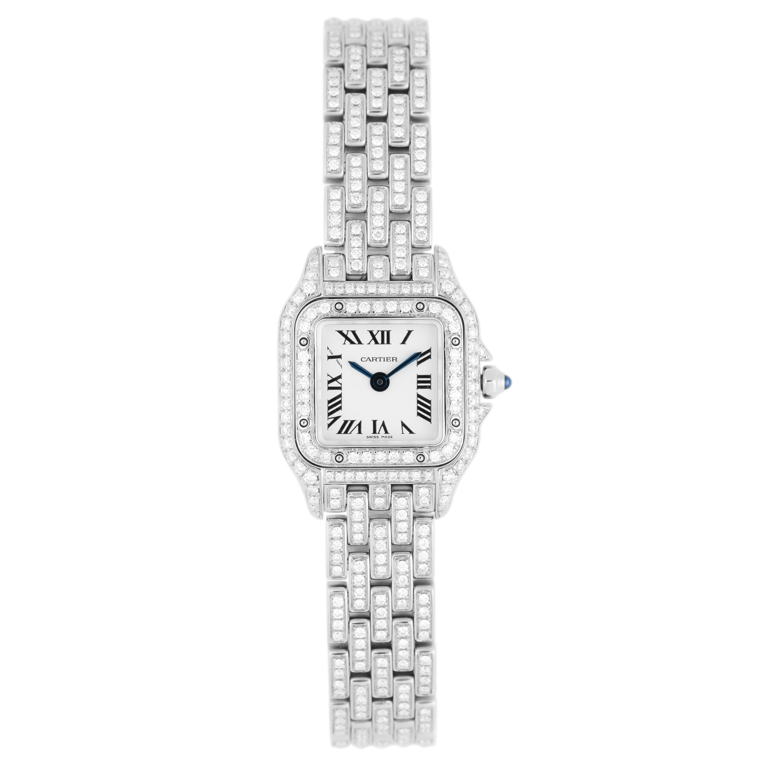 The all stainless steel Panthère de Cartier watch medium model is powered by a swiss quartz movement within a 23mm case. The bezel is set with brilliant-cut diamonds and the crown is set with a synthetic blue spinel.