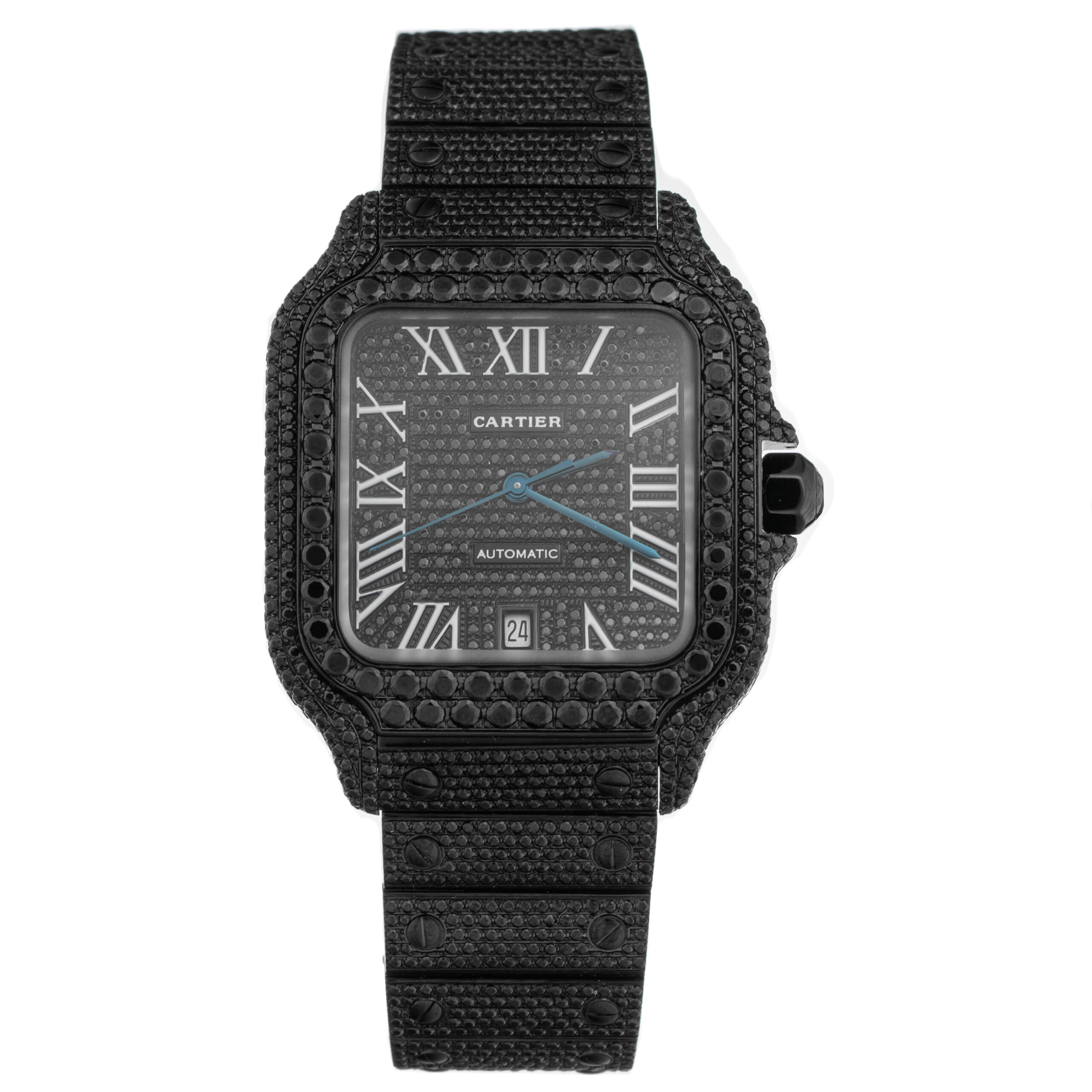 Factory Stainless Steel case and band entirely covered in genuine natural black diamonds. The diamond are set on an a customized steel bezel in a hand-set prong setting. All diamonds on the band set in an incredible even and close setting for an amazing shine. Diamonds are set on the original case and the original solid stainless bracelet.