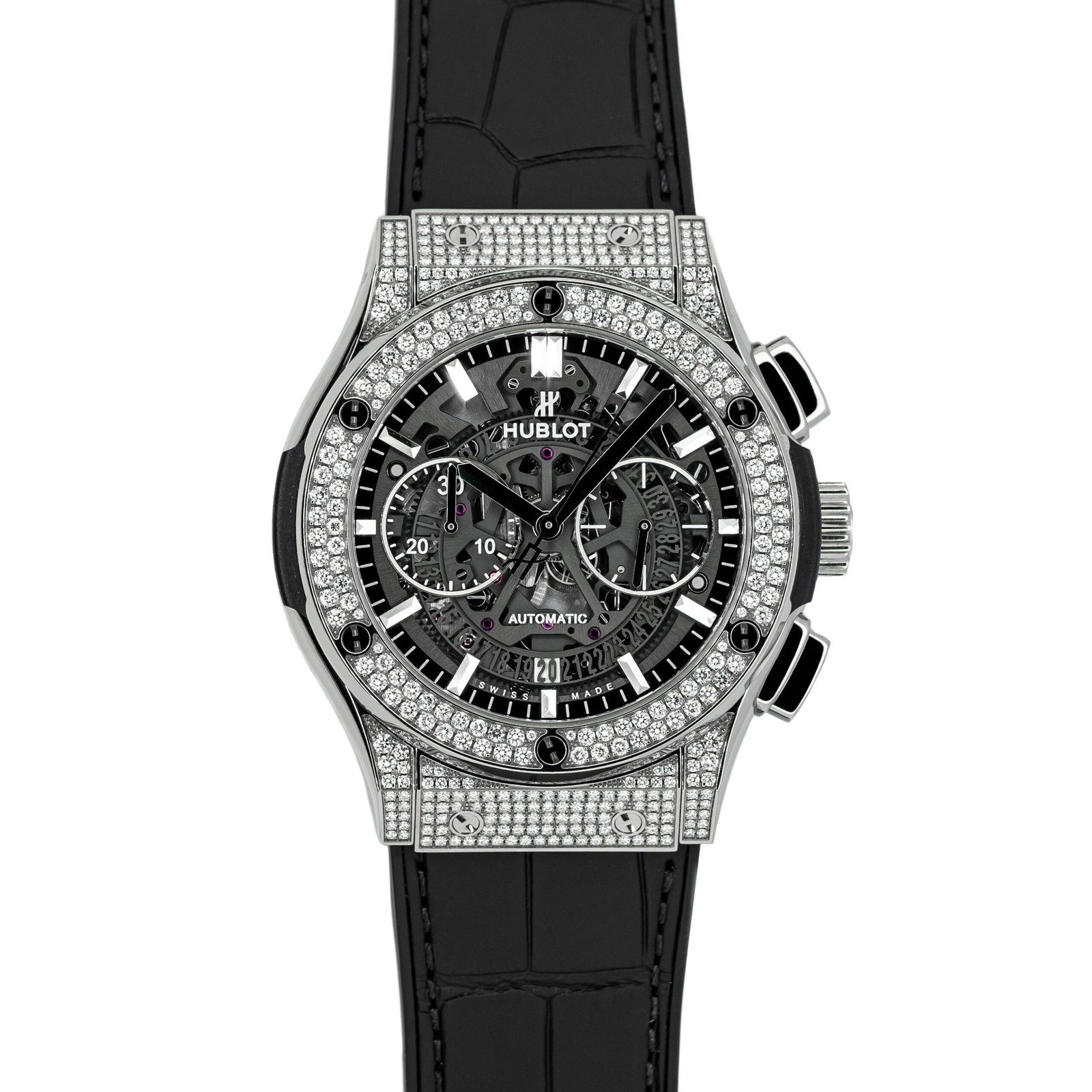 The watch has a 45.00 mm titanium case that is set with diamonds on the fixed bezel, adding a touch of luxury to the watch. The see-through dial with silver-tone hands and index hour markers is elegant and easy to read. The front side of the watch is prot