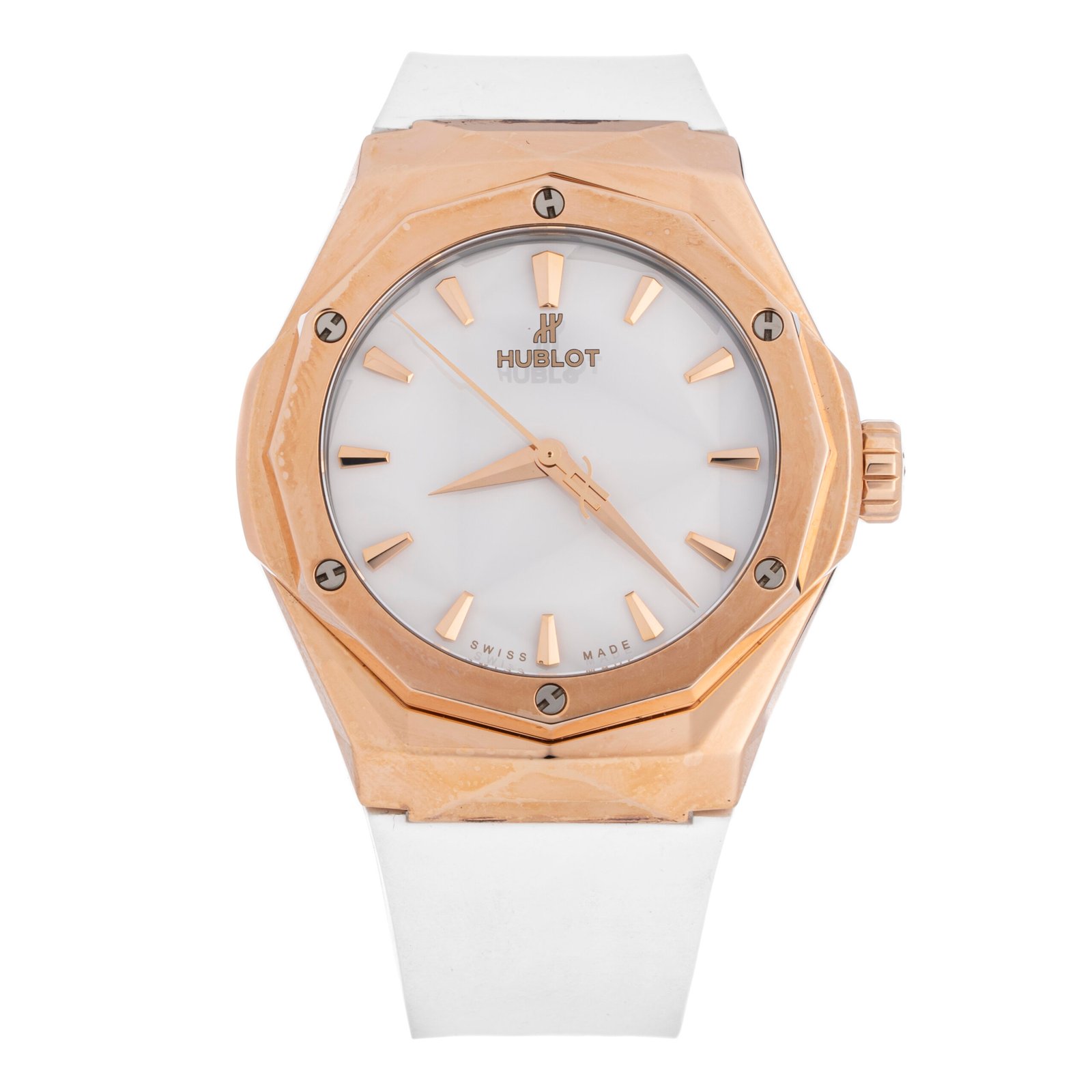 40 mm polished 18k king gold case, polished 18K king gold bezel with 6 H-shaped titanium screws, sapphire crystal with anti-reflective treatment, polished faceted white dial