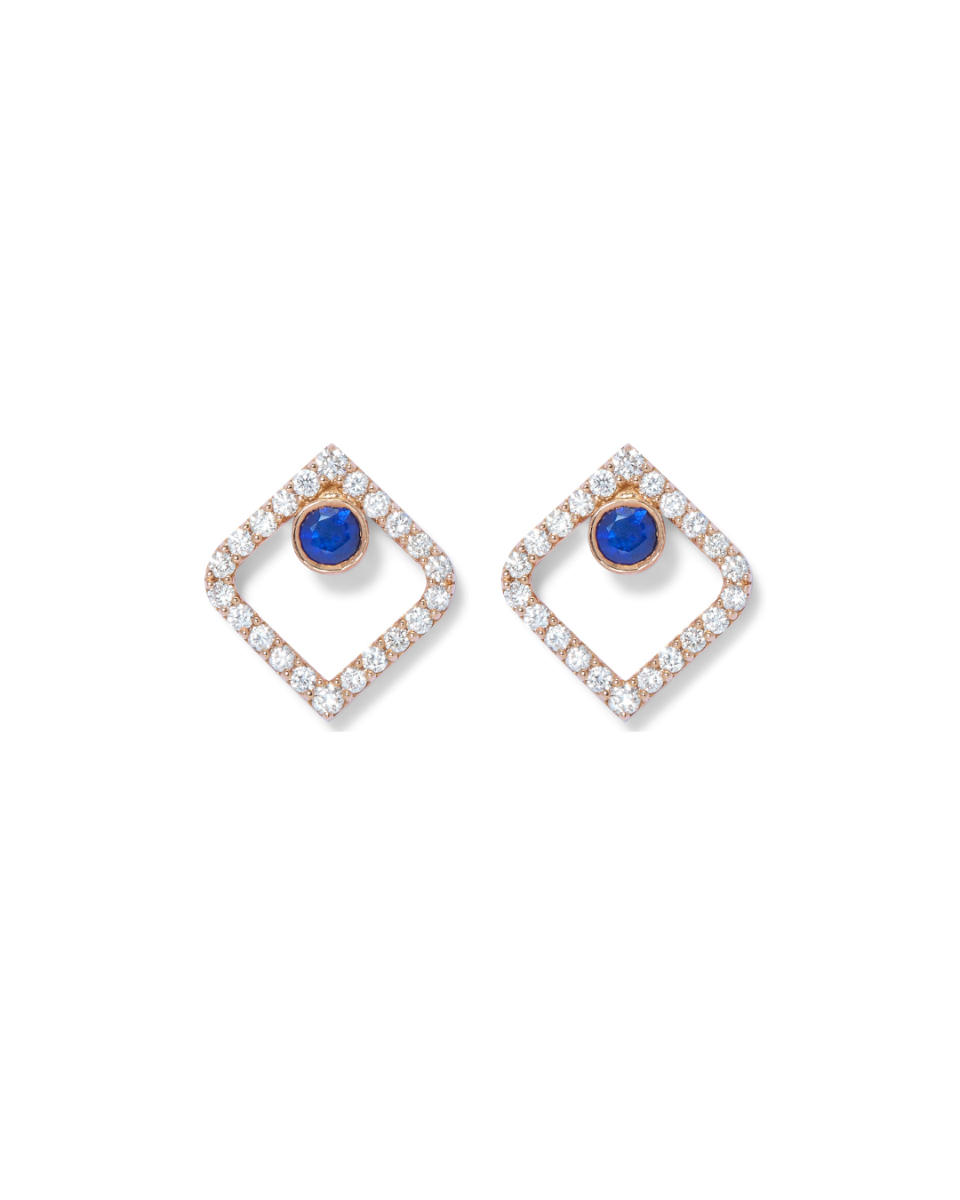 Each stud features a captivating blue sapphire center, beautifully surrounded by a halo of sparkling diamonds.