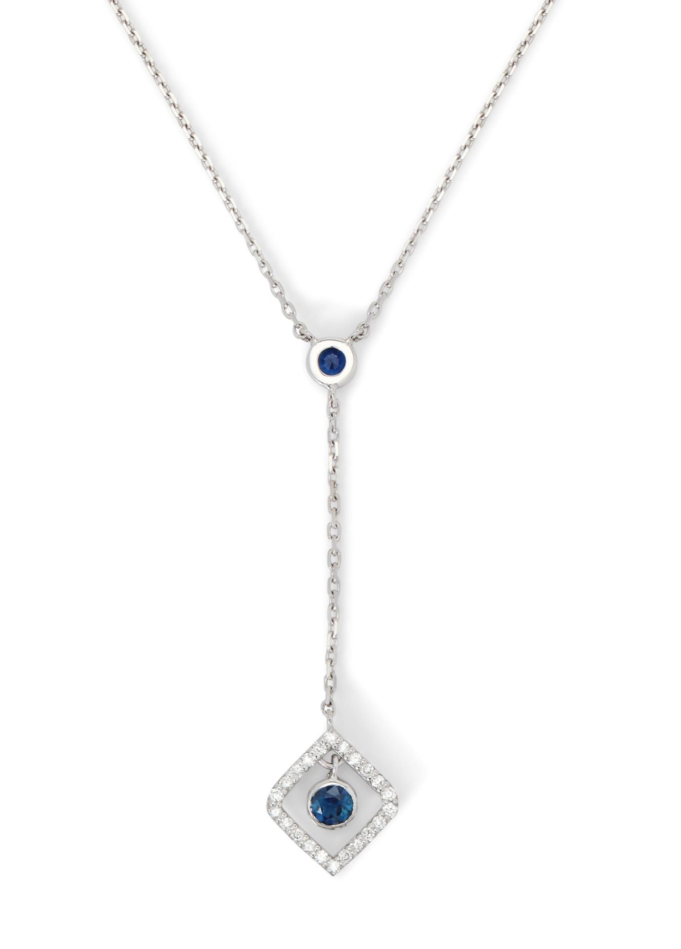 Handcrafted in 18k white gold. This captivating piece features two vibrant blue sapphires, elegantly framed by shimmering diamonds, creating a striking focal point.