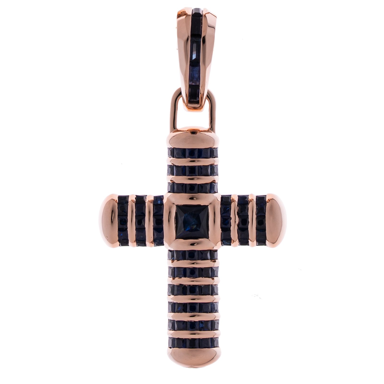Sculpted in luminous 18k rose gold and set with rich blue sapphires, this cross pendant exudes strength and sophistication—crafted for those who stand out effortlessly.