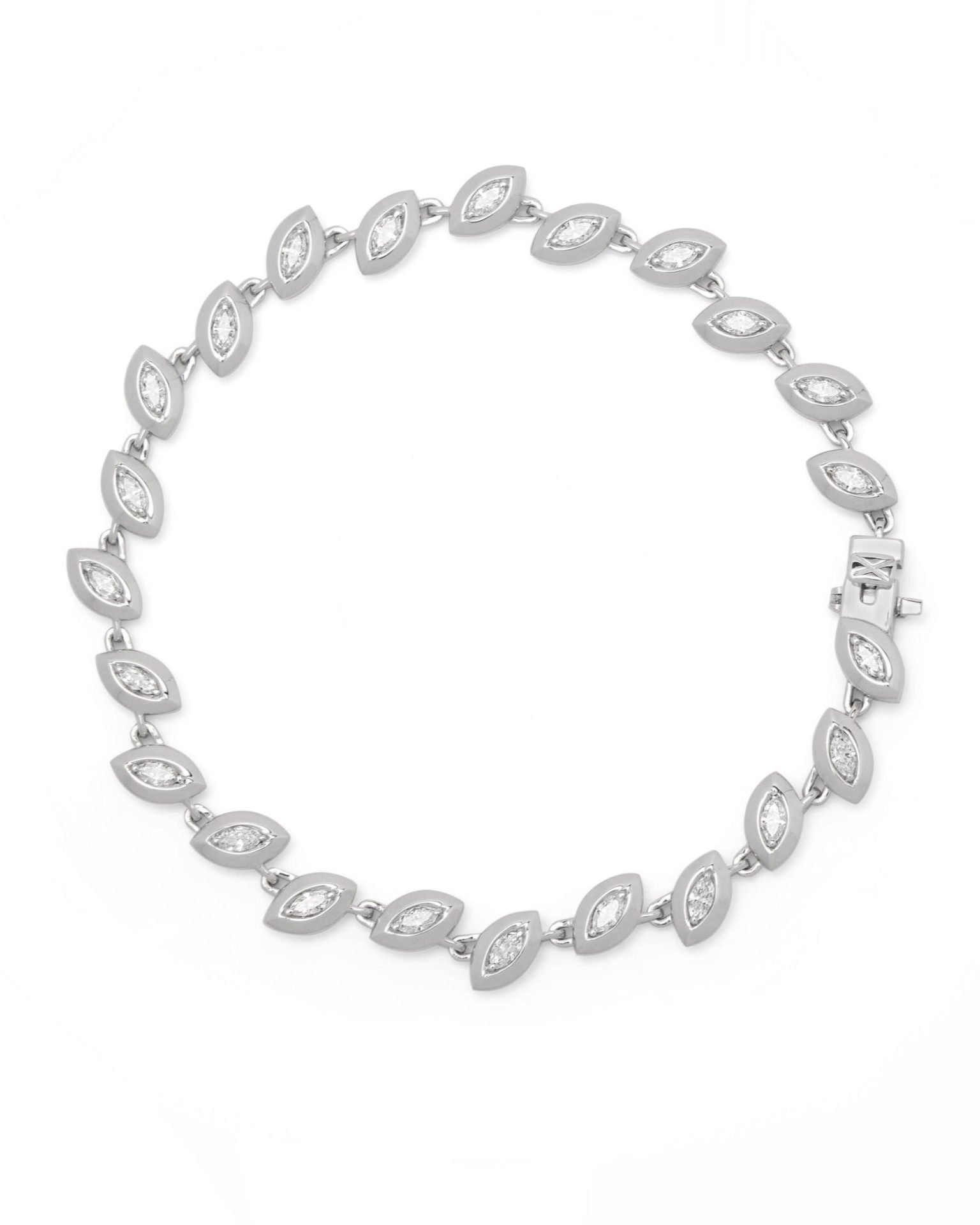 This exquisite bracelet features a continuous line of lustrous marquise-shaped diamonds, meticulously set in luxurious white gold. Each diamond is expertly crafted to reflect light, creating a mesmerizing dance of brilliance around your wrist. With a total carat weight that offers just the right amount of sparkle.