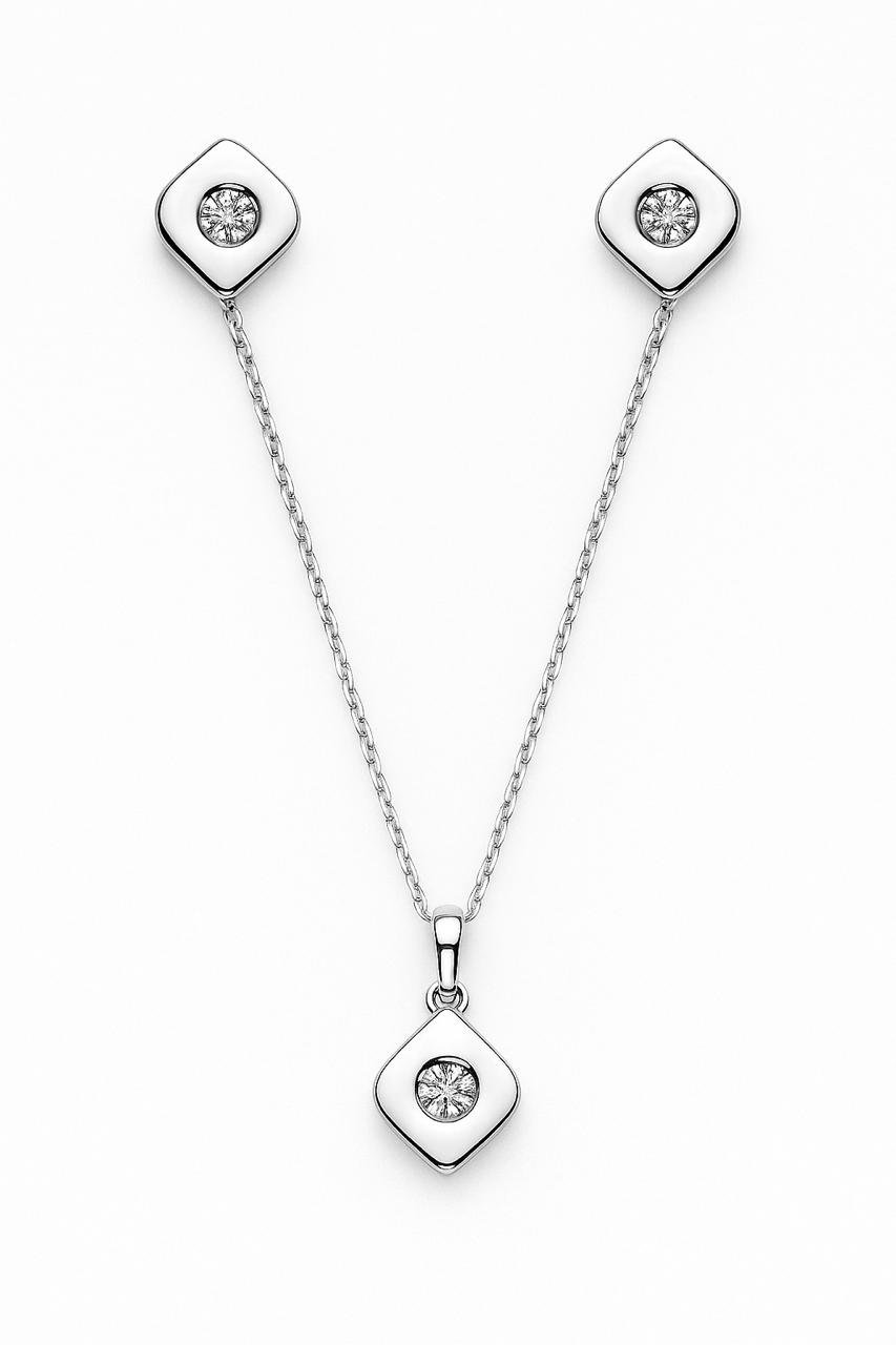 A stunning two-piece diamond set crafted in 18K white gold, weighing 6 grams and adorned with three brilliant solitaire diamonds.