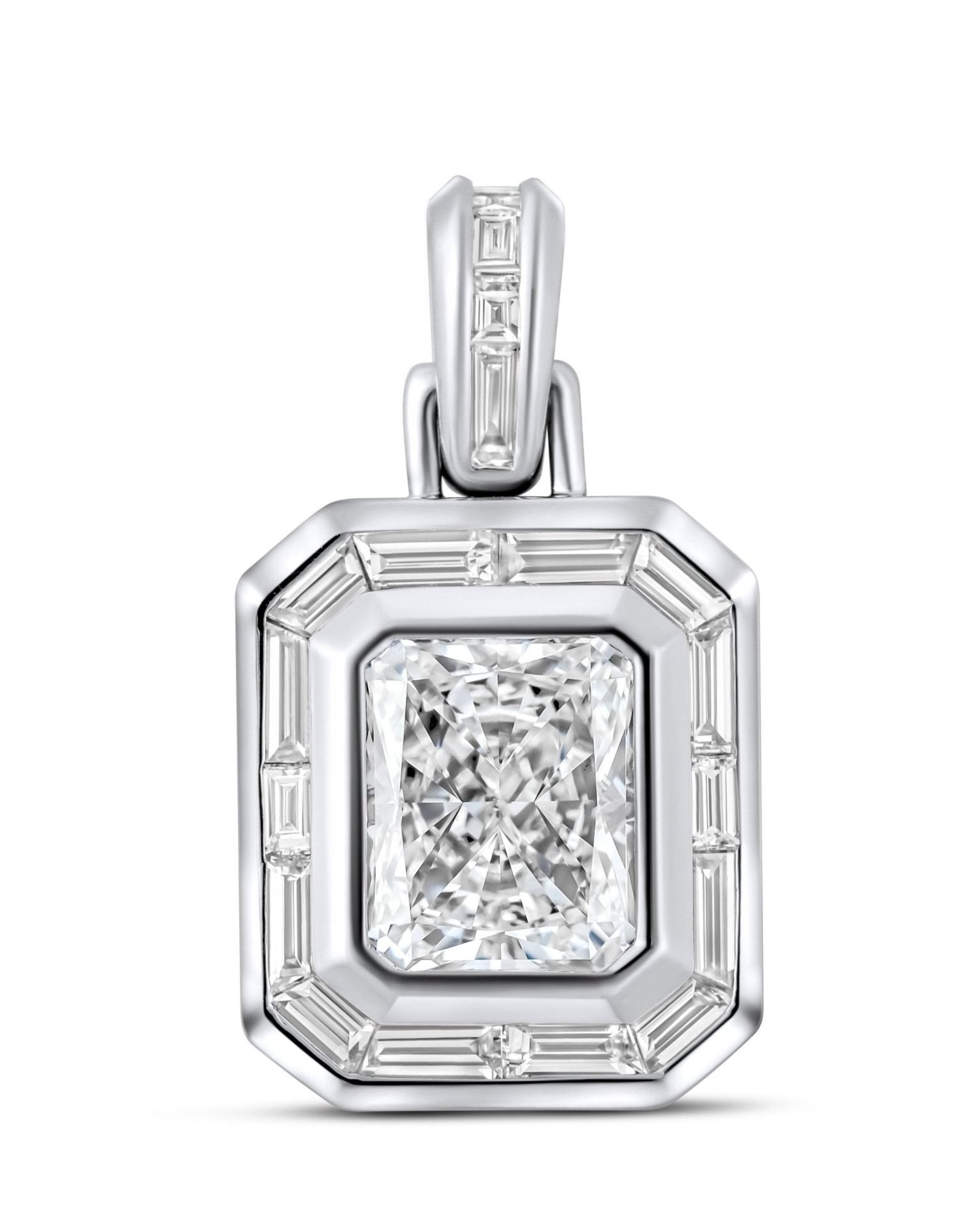 At the heart of the pendant lies a magnificent 3.01-carat radiant-cut diamond, graded H-VS1, its brilliance and clarity radiating elegance and sophistication. Surrounding this central gem are 1.95 carats of impeccably cut baguette diamonds, artfully set to enhance the sparkle of the radiant centerpiece. The interplay of diamond cuts in this unique composition creates a harmonious balance of light and texture, resulting in a pendant that is both bold and graceful.