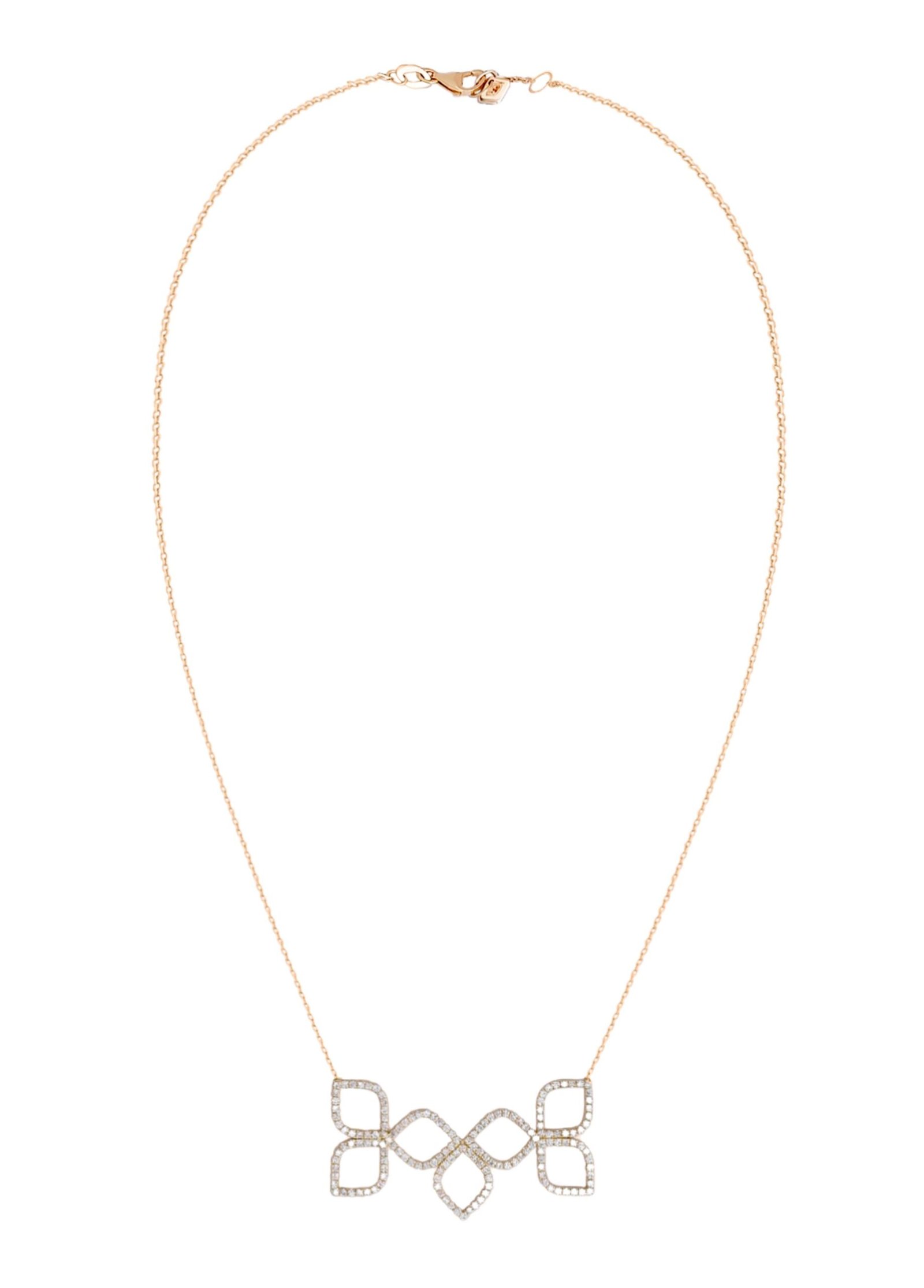 This exquisite necklace is meticulously handcrafted in 18k rose gold, set with shimmering diamonds that accentuate its unique organic shape.