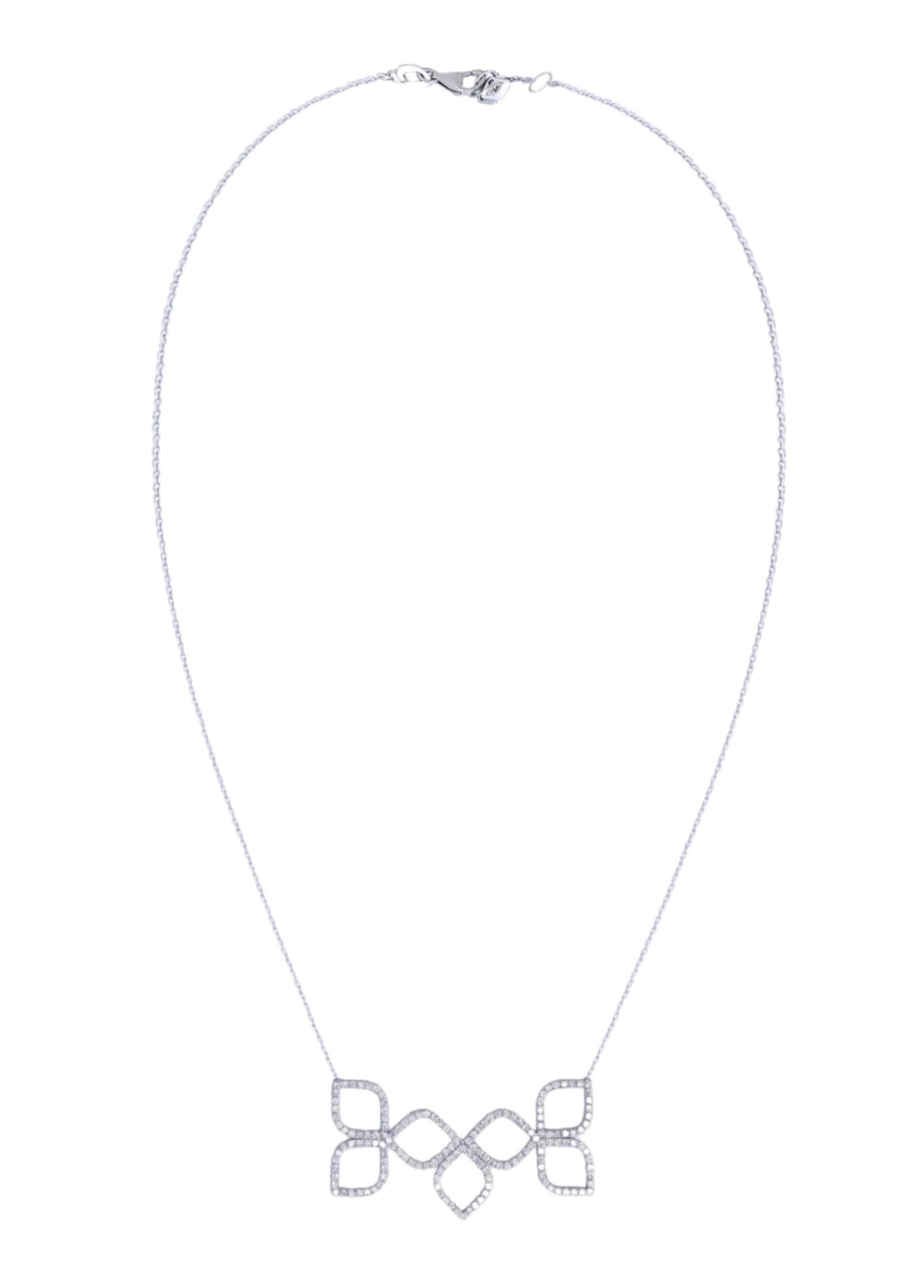 This exquisite necklace is meticulously handcrafted in 18k white gold, set with shimmering diamonds that accentuate its unique organic shape.