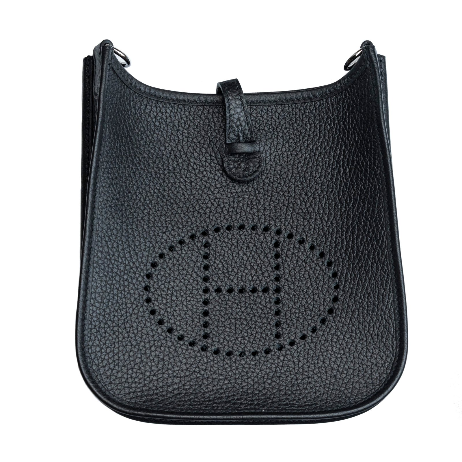 The Hermès Mini Evelyne TPM in Clemence Black is a sleek, casual crossbody bag made from soft, slouchy Clemence leather in classic black. It features the signature perforated “H” logo, an adjustable canvas strap, and cool-toned palladium hardware. Minimalist and versatile, it’s perfect for everyday hands-free style.