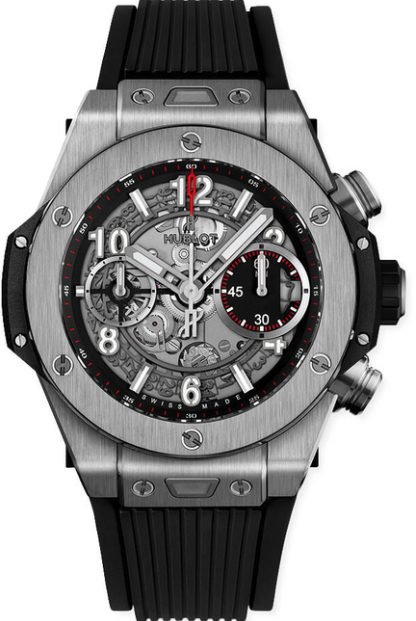 Grey polished titanium case with a black rubber strap. Fixed grey polished titanium bezel. Matt black skeleton dial with luminous silver-tone hands and alternating Arabic numeral and index hour markers.