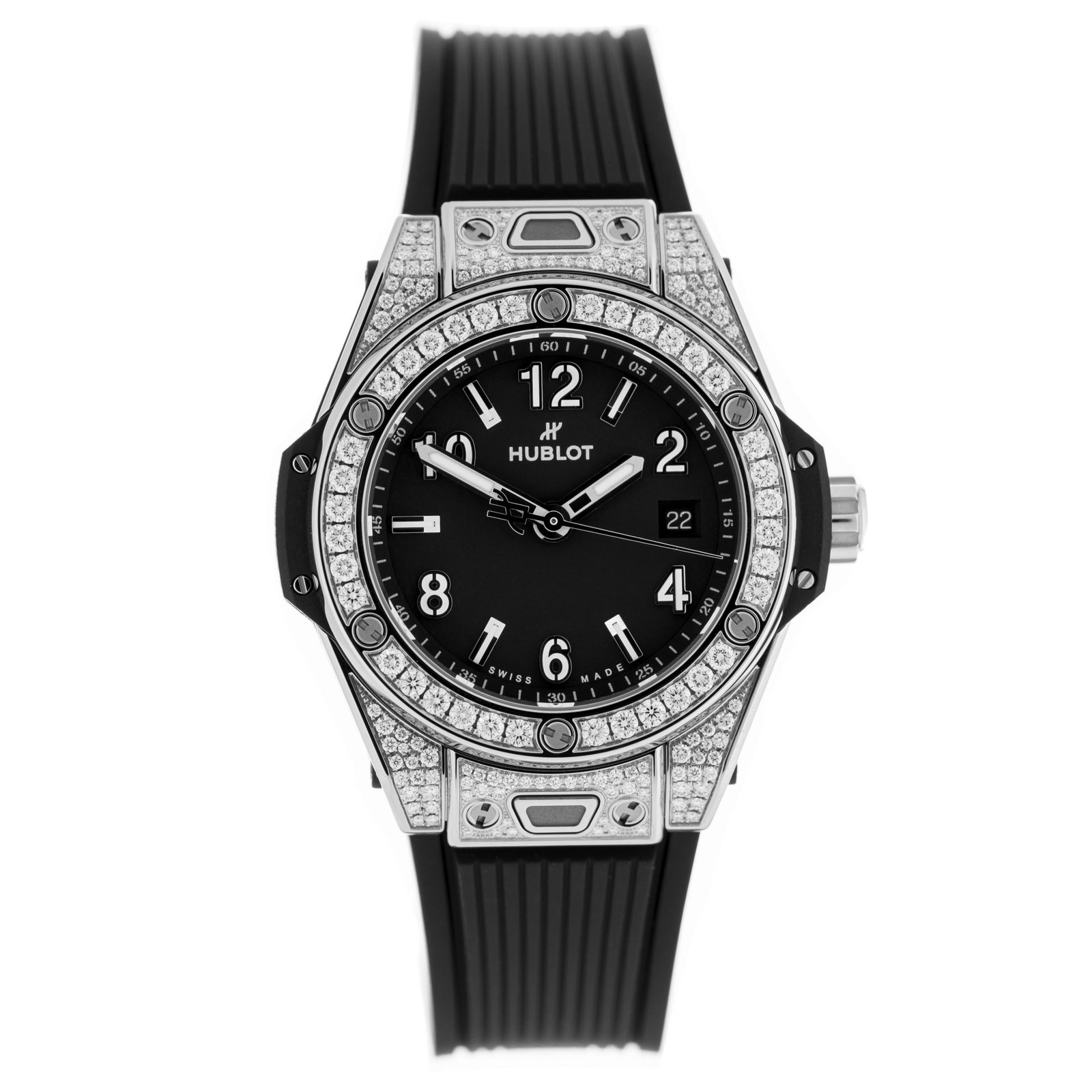 130 diamonds for 0.4ct, polished stainless steel bezel set with 36 diamonds for 0.76ct, sapphire crystal with anti-reflective treatment, matte black dial, HUB1120 self-winding movement, approximately 40 hours of power reserve