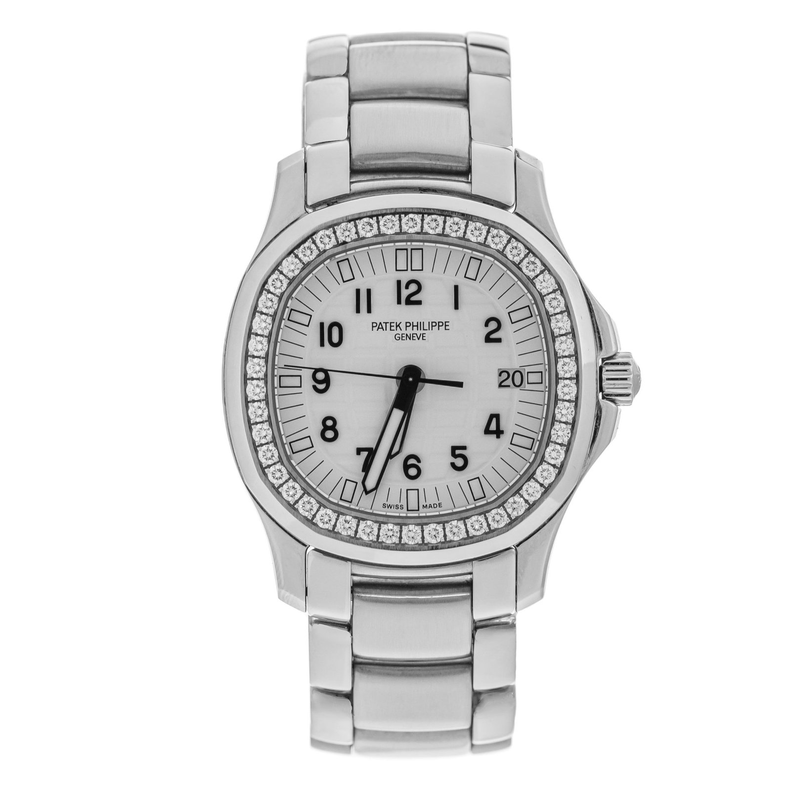 A ladies Aquanaut wristwatch crafted in steel by Patek Philippe. Featuring a white embossed dial with a date aperture and a stainless steel bezel set with 46 round brilliant cut diamonds.