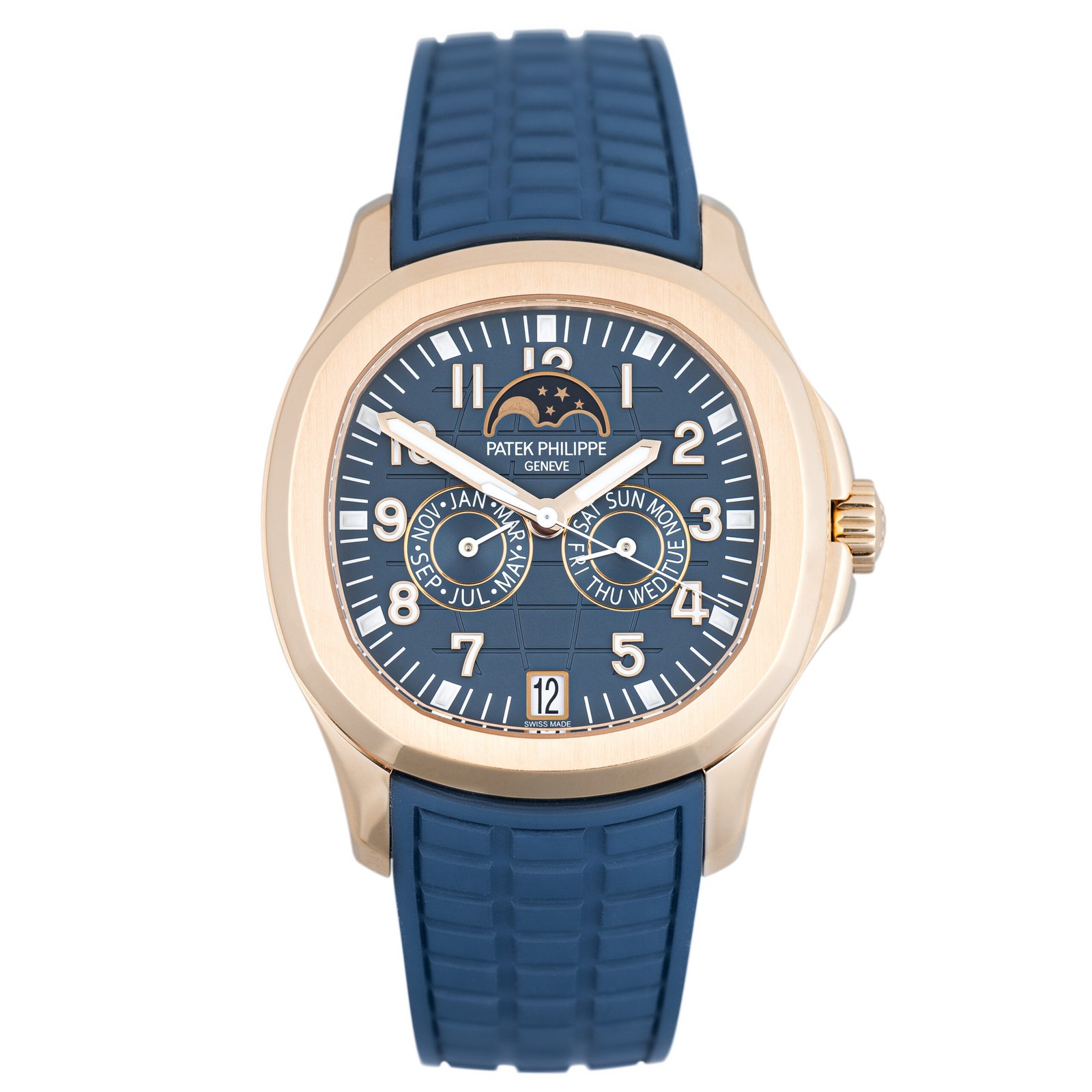atek Philippe Aquanaut is designed in a 39.9mm rose gold case, and styled on a blue rubber strap. The blue-gray dial features Annual Calendar complications, including Moon Phase timekeeping capabilities.