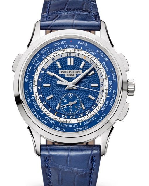 The Patek Philippe World Time Chronograph Ref. 5930G is a masterful fusion of global sophistication and technical innovation. Housed in a 39.5 mm platinum case, it combines world-time functionality with a flyback chronograph—a rare and complex pairing in watchmaking. Its striking green hand-guilloché dial displays 24 time zones simultaneously, framed by polished city rings and elegant white-gold hands. Powered by the self-winding Caliber CH 28-520 HU, it offers exceptional precision and a 50-hour power reserve. Complemented by a shiny green alligator strap, this timepiece embodies Patek Philippe’s heritage of elegance, craftsmanship, and cosmopolitan style.