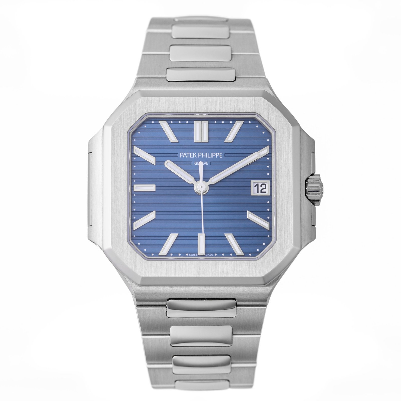 Crafted entirely in 18k white gold, this Nautilus offers a more versatile and modern case size, perfectly balancing presence and wearability on the wrist. The signature rounded octagonal bezel frames a striking blue dial embossed with the classic horizontal pattern, enhanced by a subtle gradient effect that deepens toward the edges—an aesthetic synonymous with the Nautilus line.