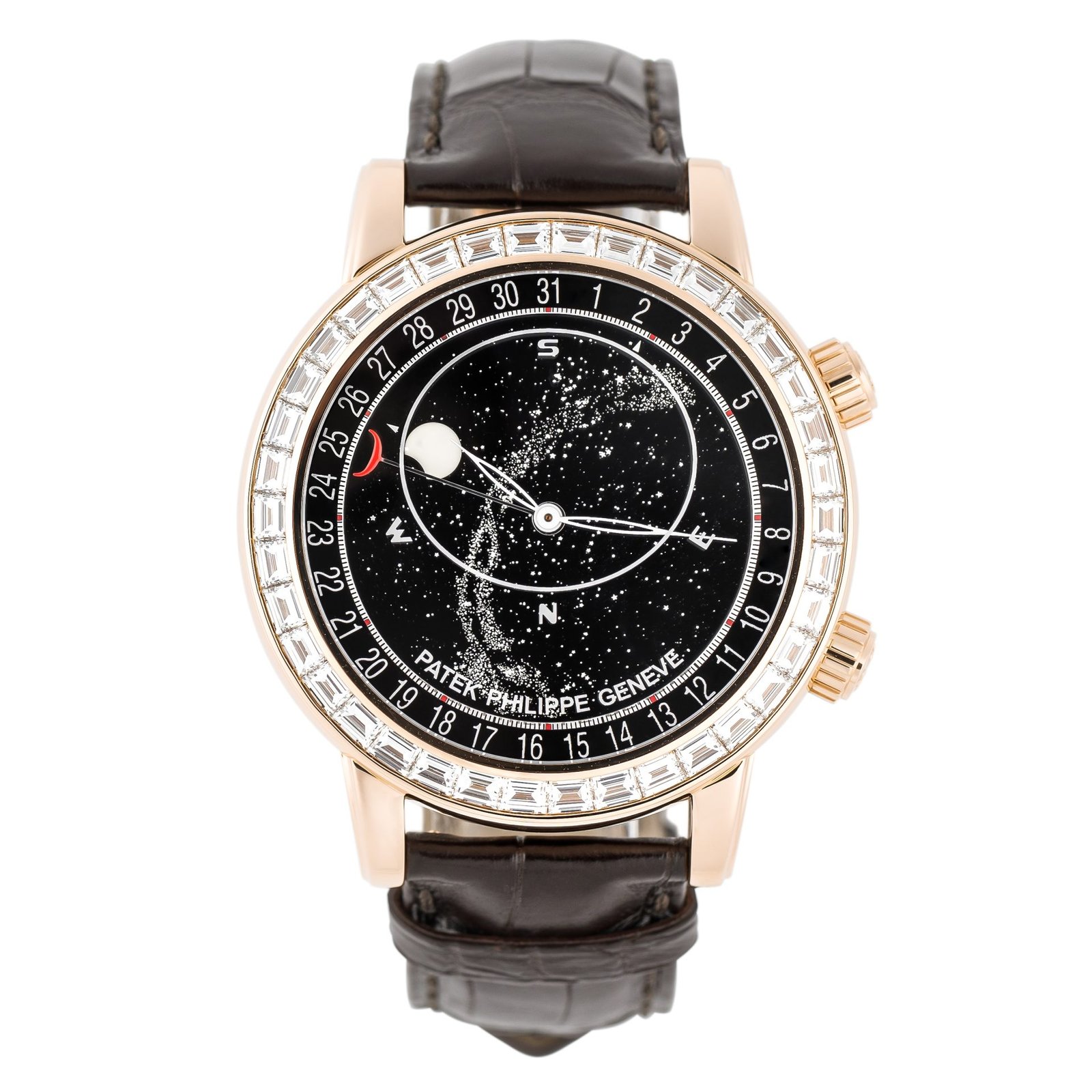 18kt rose gold case with a black alligator leather strap. Fixed 18kt rose gold 38 baguette diamond set bezel. Black dial with silver-tone skeleton leaf-style shape hands and Arabic numeral hour markers