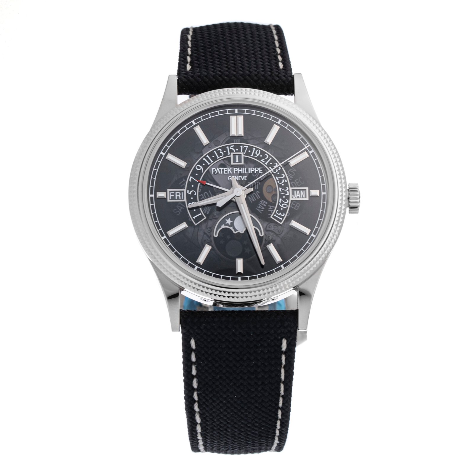 Sapphire crystal with gray metallization and black-gradient rim, white gold applied faceted baton-style hour markers with white luminescent coating. White gold faceted dauphine-style hands with white luminescent coating.