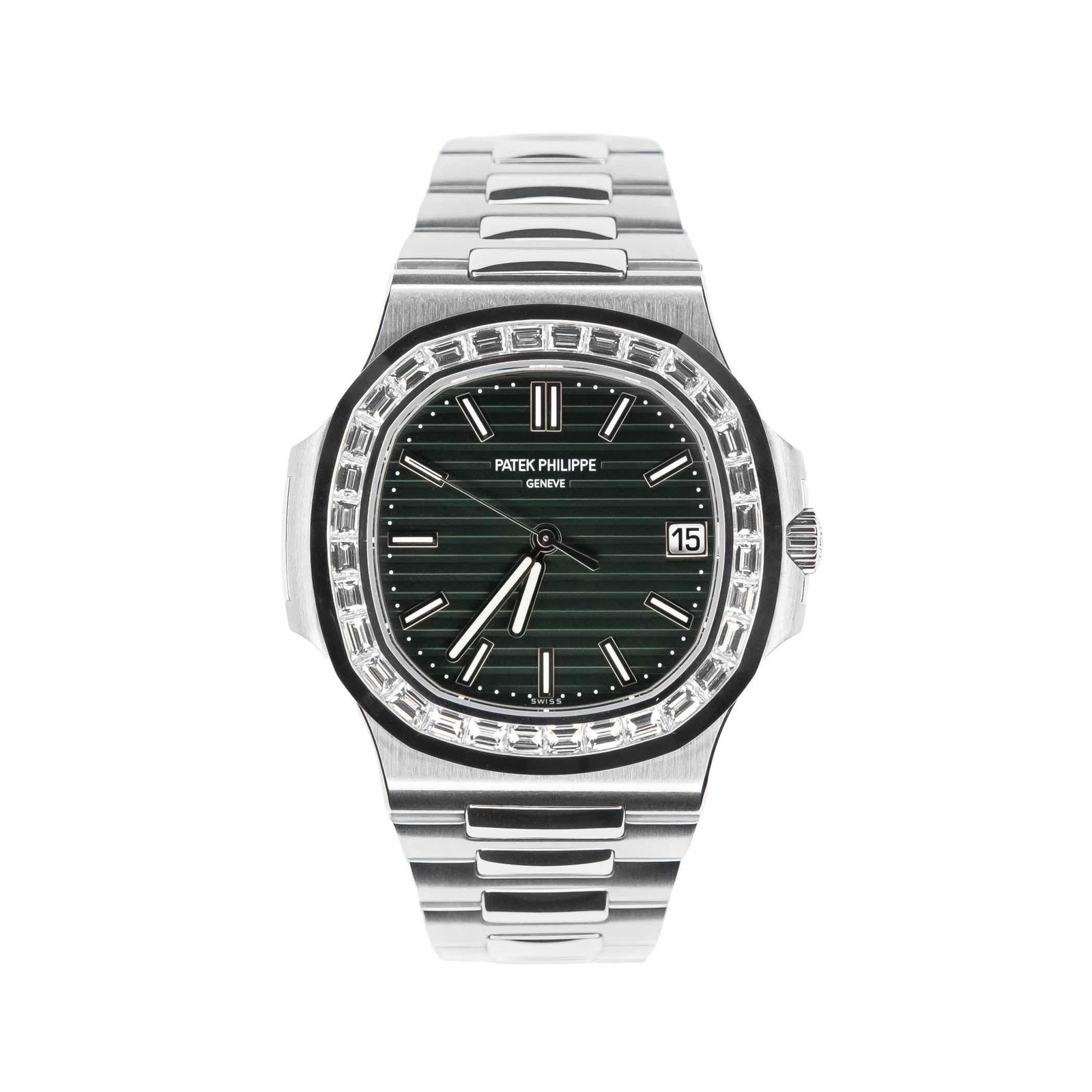 Self – winding automatic watch, features a 40mm stainless steel case with a diamond bezel surrounding an olive green sunburst dial on a stainless steel bracelet with folding buckle. Functions include hours, minutes, seconds and date.