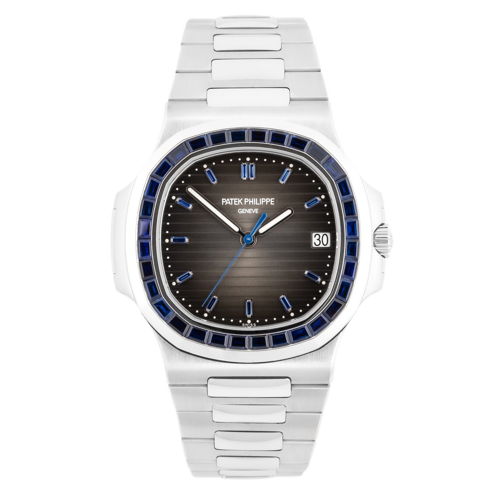 The platinum gem-set Nautilus Ref. 5711 models were reserved for Patek Philippe’s most exclusive clients. The more flamboyant cousin of the iconic steel sports watch from the Geneva watchmaker, the Ref. 5711/111P-001 is distinguished by its bezel, set with 32 baguette-cut blue sapphire stones.