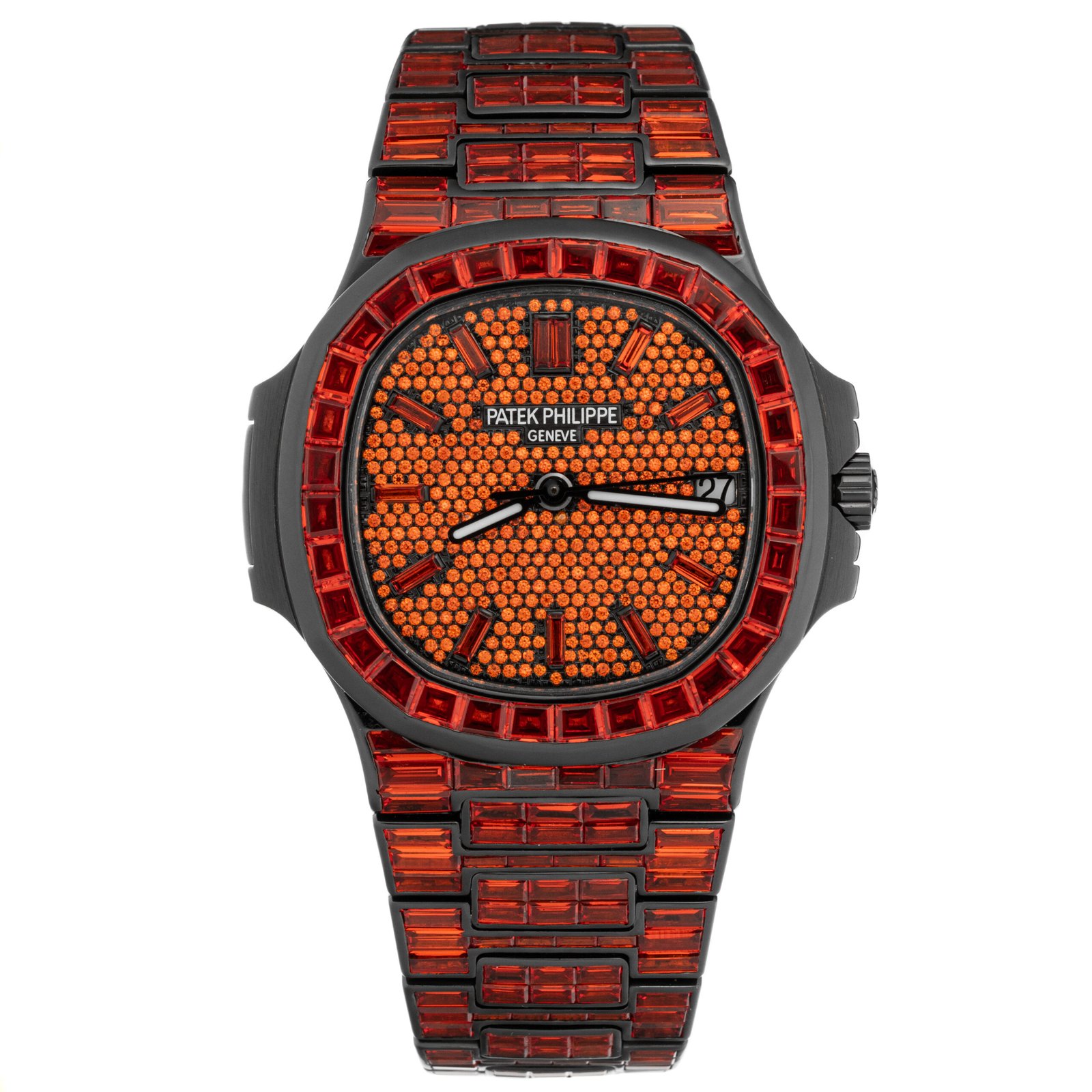 This piece is intended for collectors seeking a custom luxury build that combines an authentic high-horology movement with a modern, statement design. It is not represented as an original Patek Philippe Nautilus and should not be confused with a factory model.