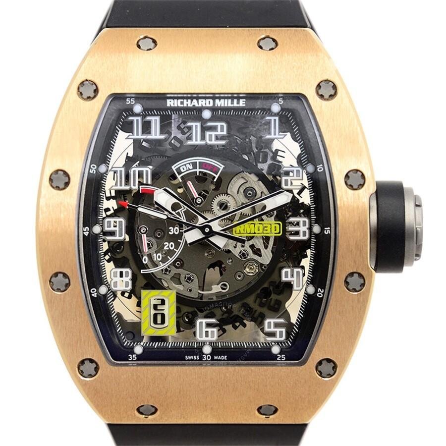 Black 18kt rose gold case with a black rubber strap. Fixed 18kt rose gold bezel. Transparent dial with Arabic numeral hour markers. Dial Type: Analog. Luminescent hands and markers.