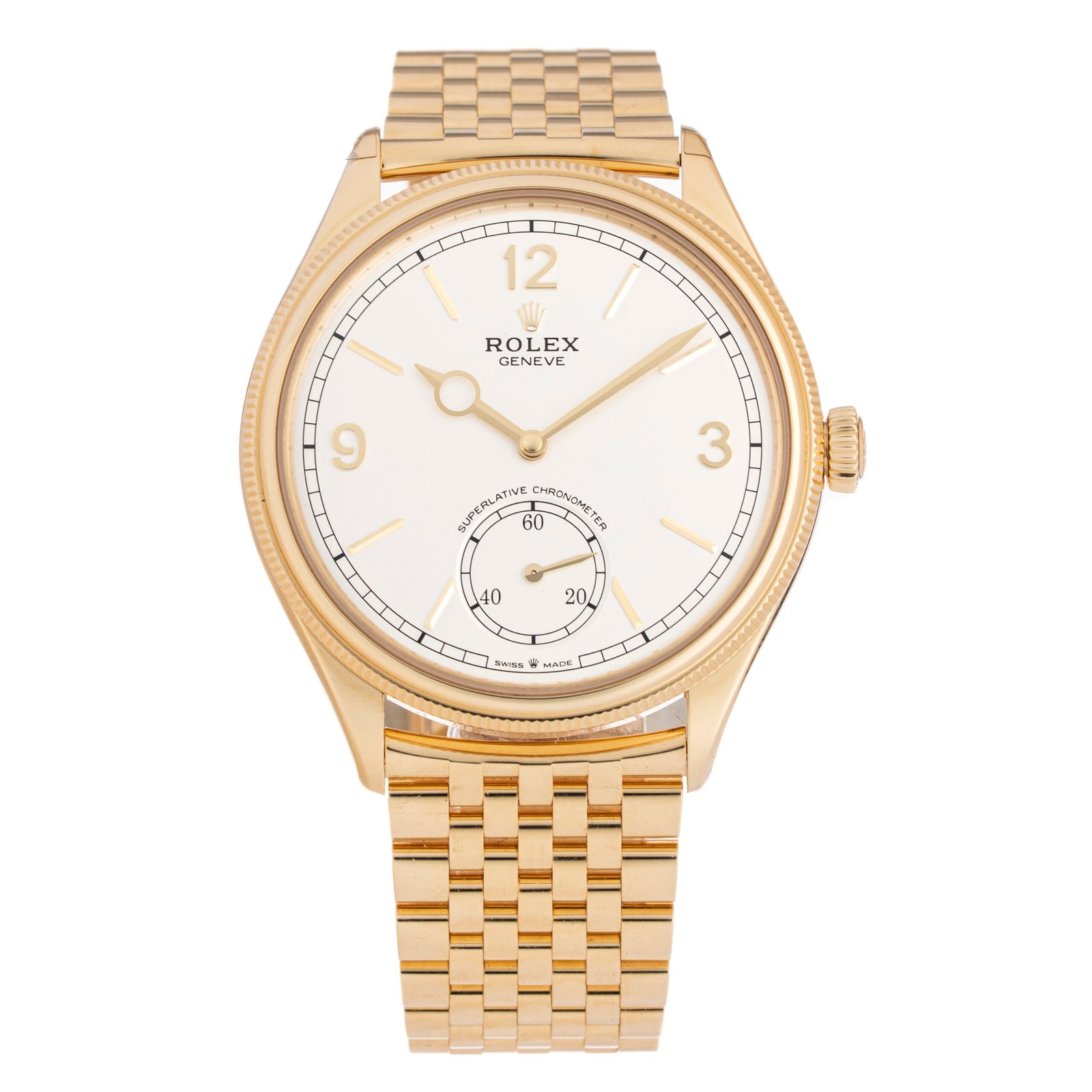 rafted entirely in Rolex’s own 18 kt yellow gold, cast and inspected in-house for exceptional quality. The case is 39 mm in diameter and approximately 9.5 mm thick, maintaining a slim profile that balances dress-watch elegance with modern refinement