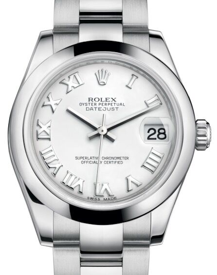Stainless steel case with a stainless steel oyster bracelet. Fixed, domed stainless steel bezel. Rhodium dial with silver tone hands and Roman numeral hour markers. Date display at the 3 o’clock position. 31 jewels automatic movement. Scratch resistant sapphire crystal. Case diameter: 31 mm. Deployment clasp. Water resistant at 100 meters/ 330 feet.