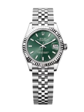 Automatic movement; purple with luminescent markers roman numerals dial; sapphire-crystal, transparent case back; and 31 mm, polished steel case on a polished steel strap with a polished steel folding clasp.