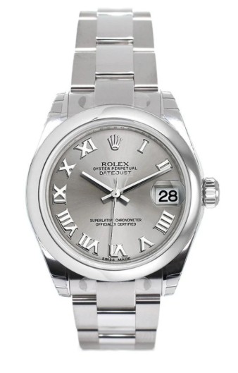 Stainless steel case with a stainless steel oyster bracelet. Fixed, domed stainless steel bezel. Rhodium dial with silver tone hands and Roman numeral hour markers. Date display at the 3 o’clock position. 31 jewels automatic movement. Scratch resistant sapphire crystal. Case diameter: 31 mm. Deployment clasp. Water resistant at 100 meters/ 330 feet.