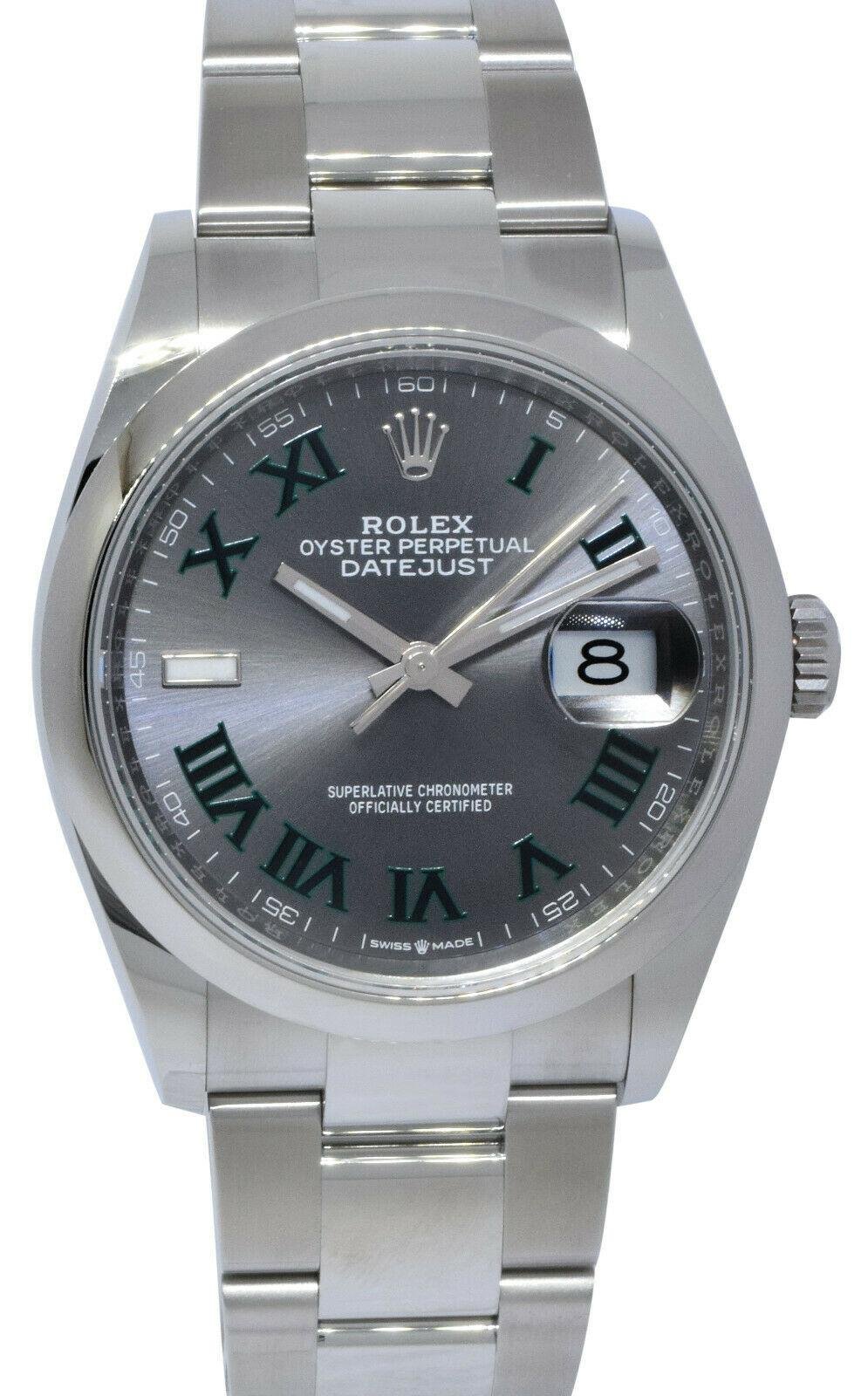 stainless steel features a grey dial with Green roman number AKA Wimbledon dial, smooth bezel and oyster bracelet with deployant buckle