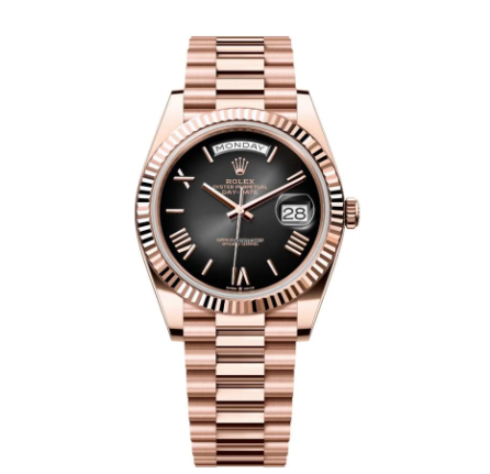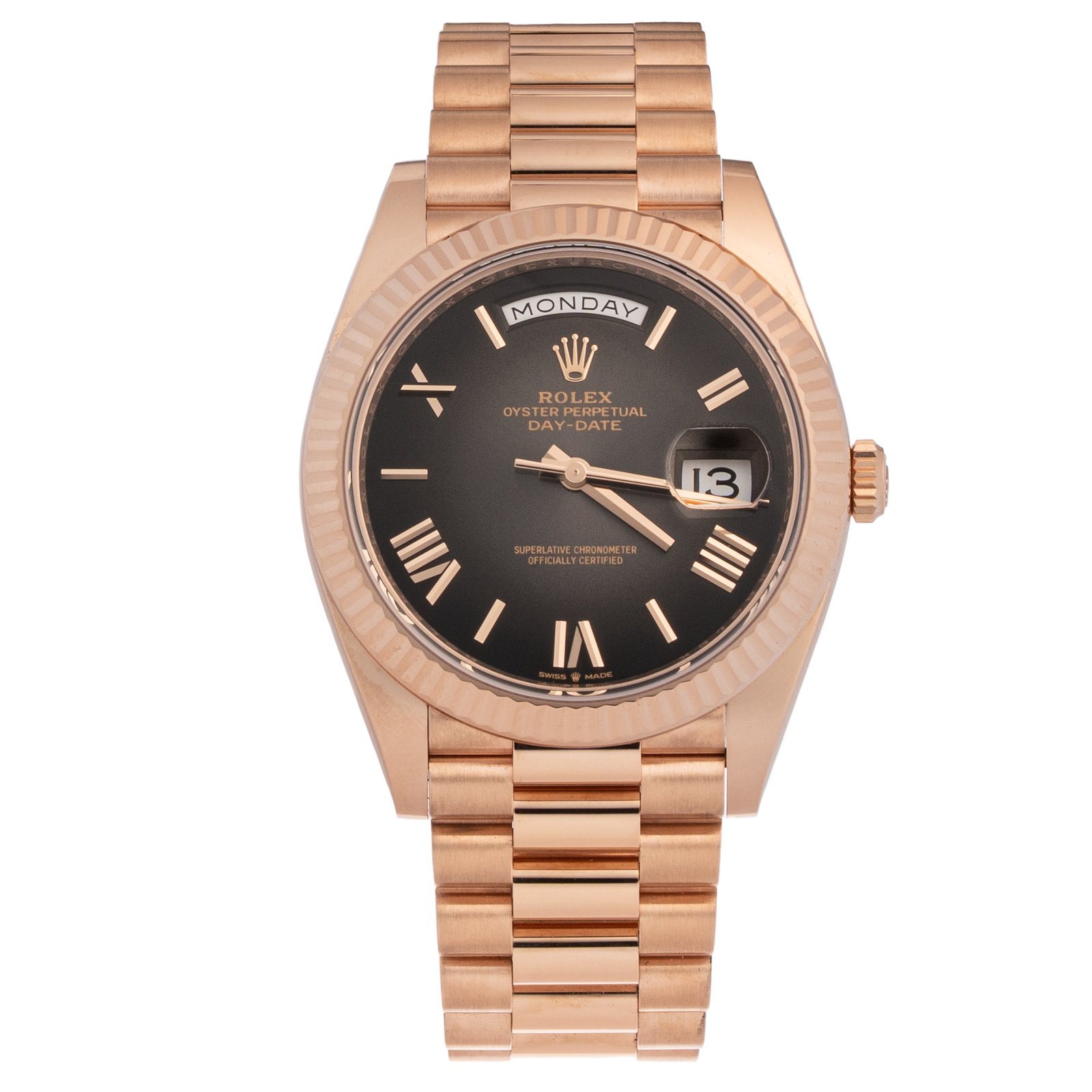 Rose gold presidential bracelet, fluted bezel, smoked dial.