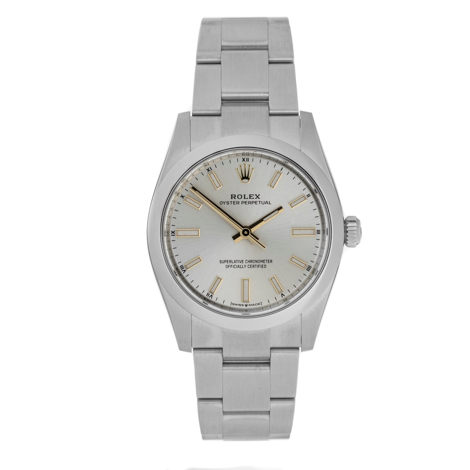 Oystersteel case, screw-down crown with twinlock double waterproofness system, domed bezel, scratch-resistant sapphire crystal, silver dial, index hour markers