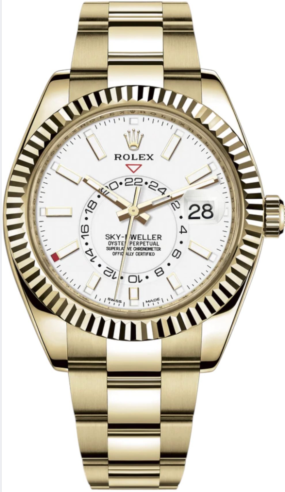 The Rolex Sky-Dweller 326938 in yellow gold with a white dial is a striking and sophisticated timepiece that has gained prominence among collectors, especially after its discontinuation. Crafted entirely from 18k yellow gold, this model showcases the brand’s dedication to luxury and precision. The 42mm case size combines elegance with a bold wrist presence, while the fluted bezel—a signature Rolex feature—adds a touch of refinement.
