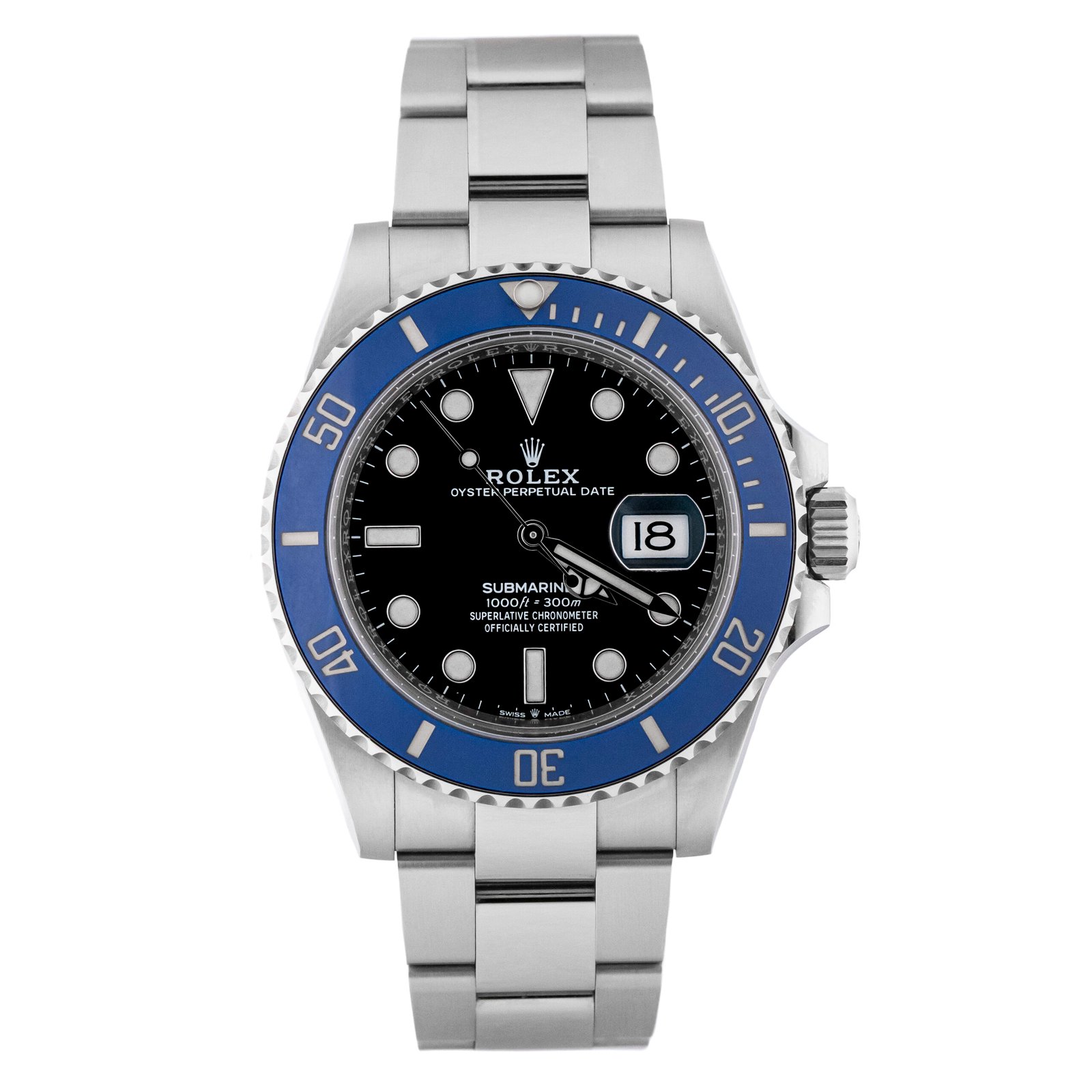 41mm Oyster case in 18ct white gold, unidirectional rotatable blue Cerachrom bezel, black dial with luminescent indices and hands, date indicator at 3 o’clock. Sapphire crystal and automatic calibre 3235.