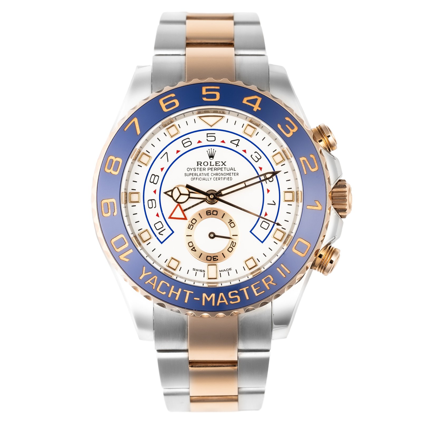 44mm stainless steel case, 18K pink gold crown and push pieces, 18K pink gold 90 degree rotatable Command bezel with blue Cerachrom insert, white dial, automatic movement with programmable countdown function, stainless steel and 18K pink gold bracelet wit