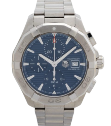A fabulous and versatile chronograph with date function, our automatic cal.16 movement Tag Heuer Aquaracer (reference CAY2112/2) features a stainless steel 43mm case and bracelet with blue dial.