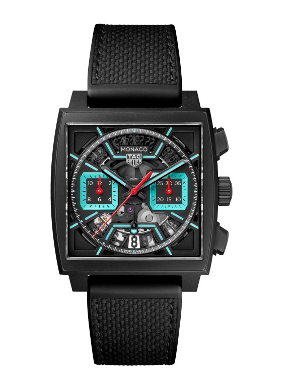 39 mm titanium DLC case, sapphire back, titanium grade 2 crown, titanium bezel, black dial, Calibre Heuer 02 automatic chronograph movement with hours, minutes, seconds, chronograph (1/4 second, 30 minutes counter, 12 hours counter, date), approximately 80 hours of power reserve, black rubber and leather strap, folding push-button buckle. Water resistant to 100 m.