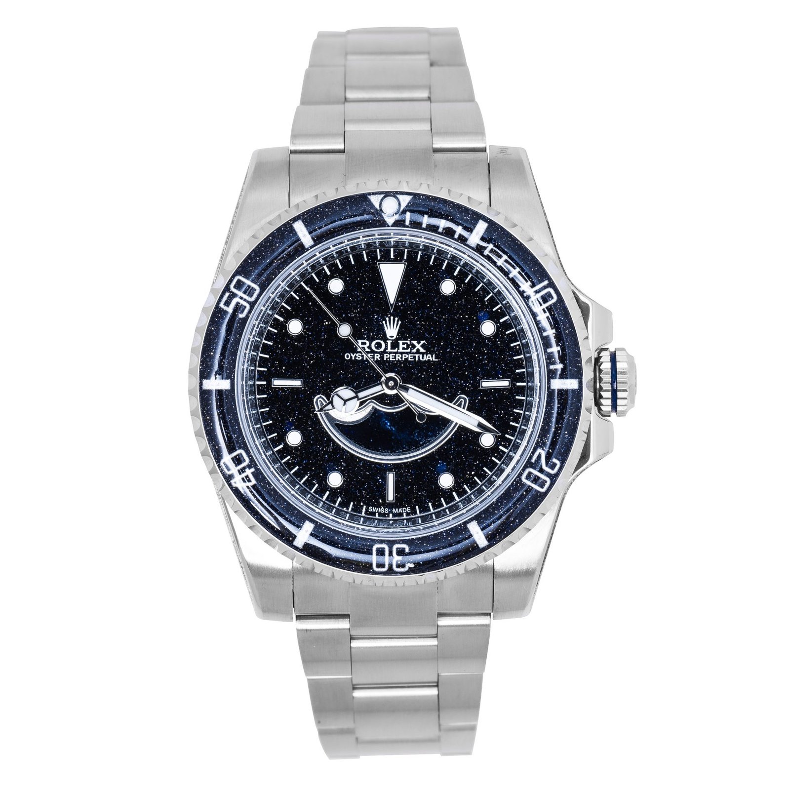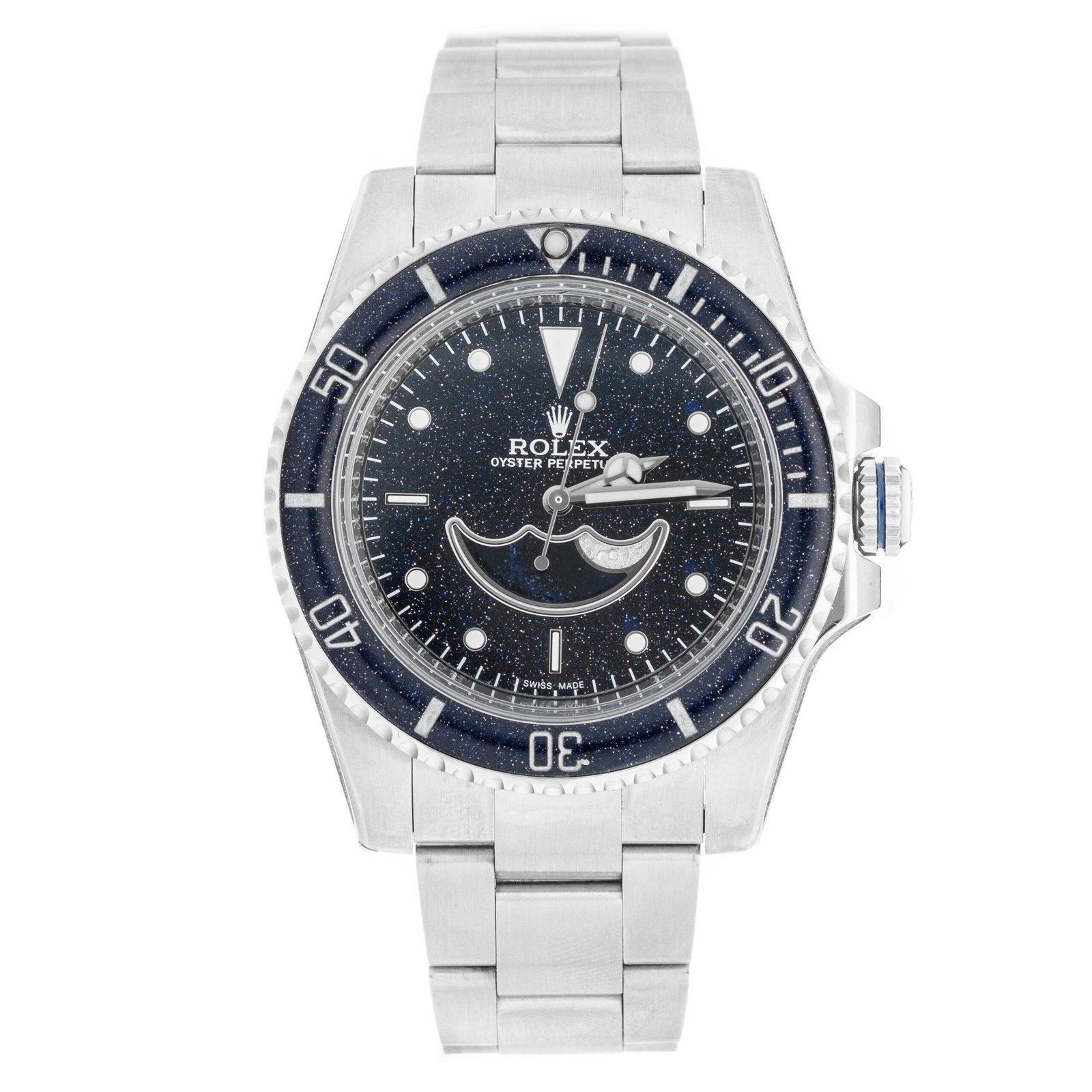 Both the bezel insert and dial are covered in aventurine glass, a form of glass with metallic inclusions that creates its characteristic sparkly appearance. And the moon phase disc is fired enamel, with twin moons made of silver that are hand engraved wit